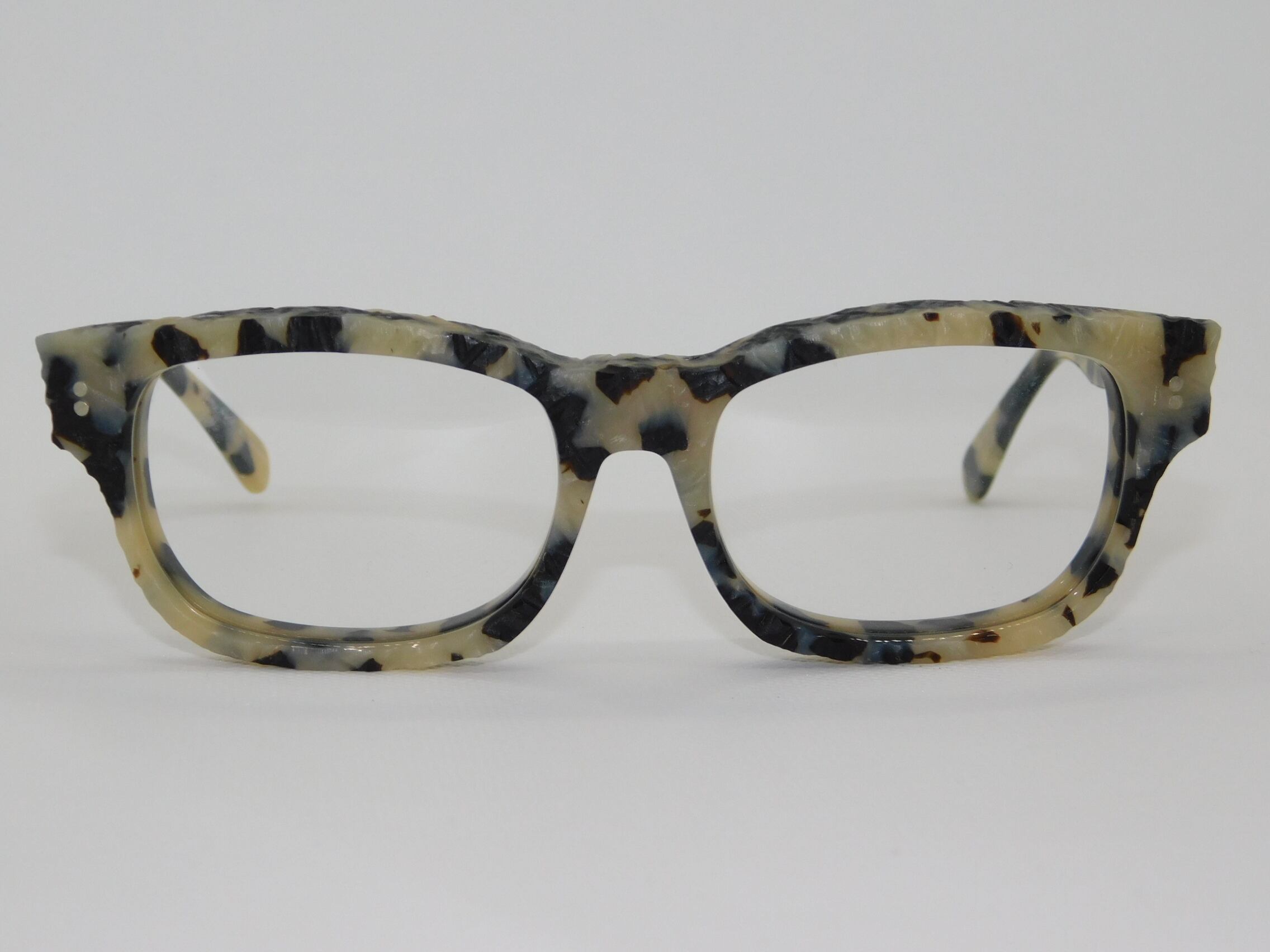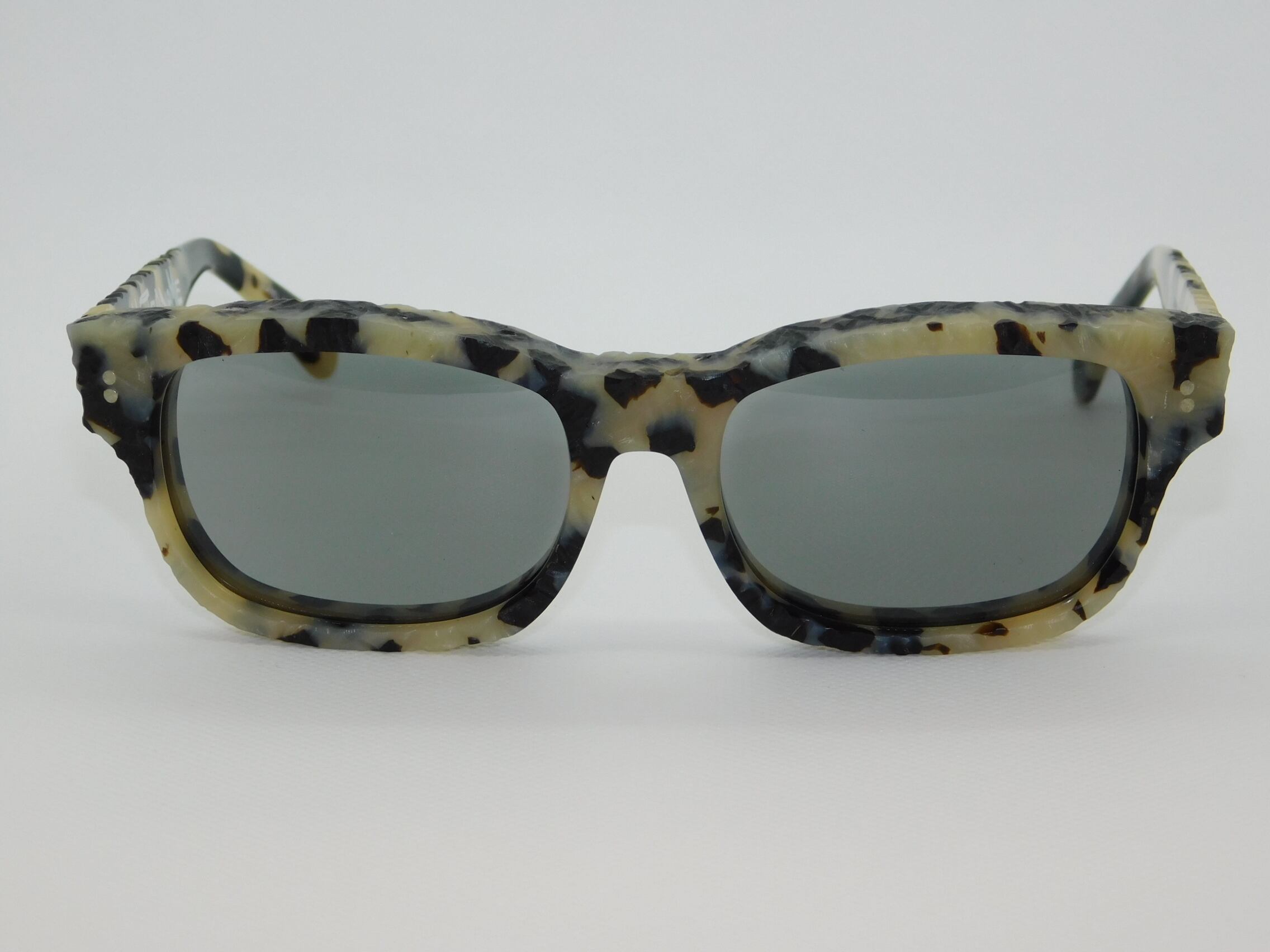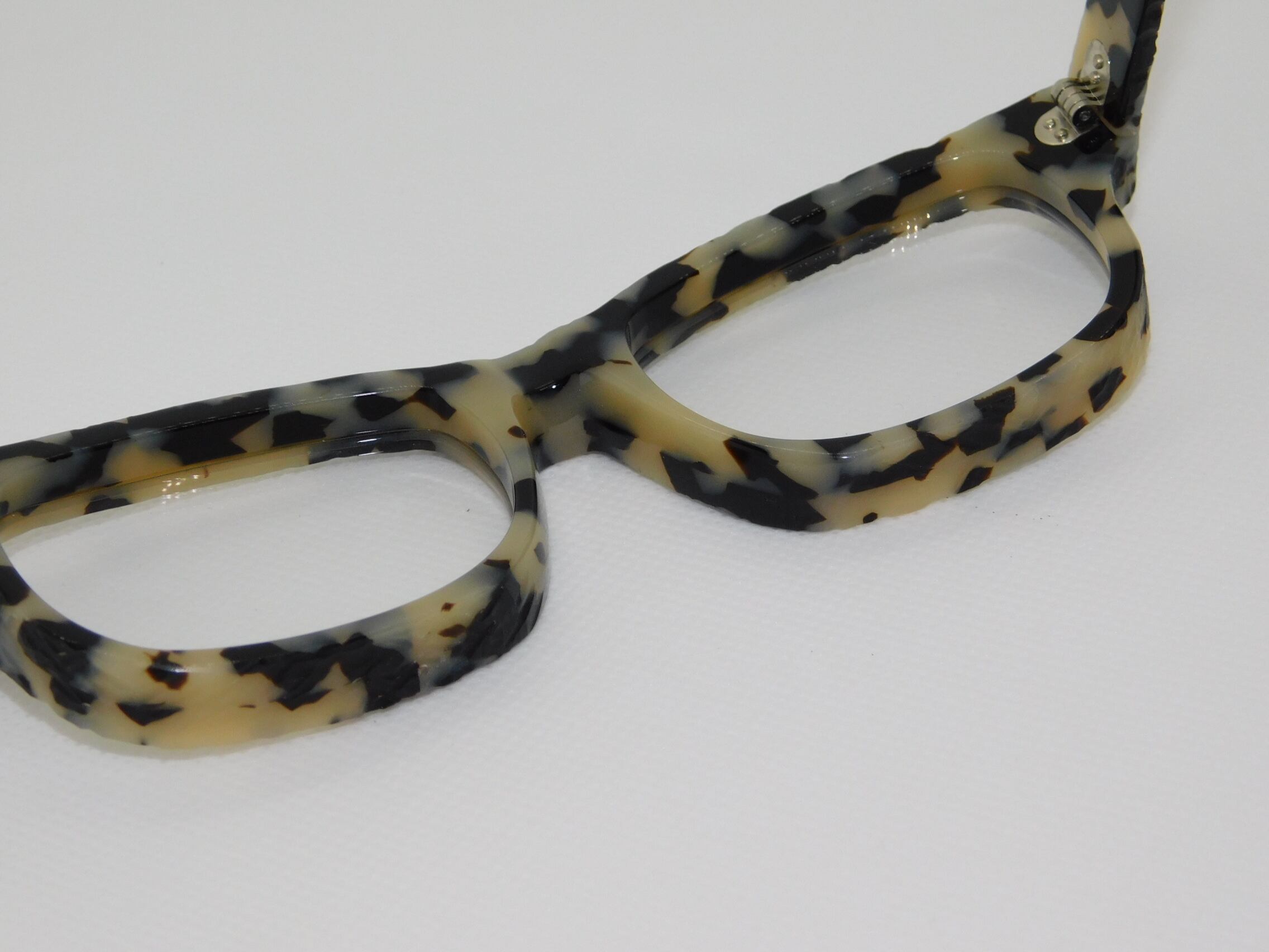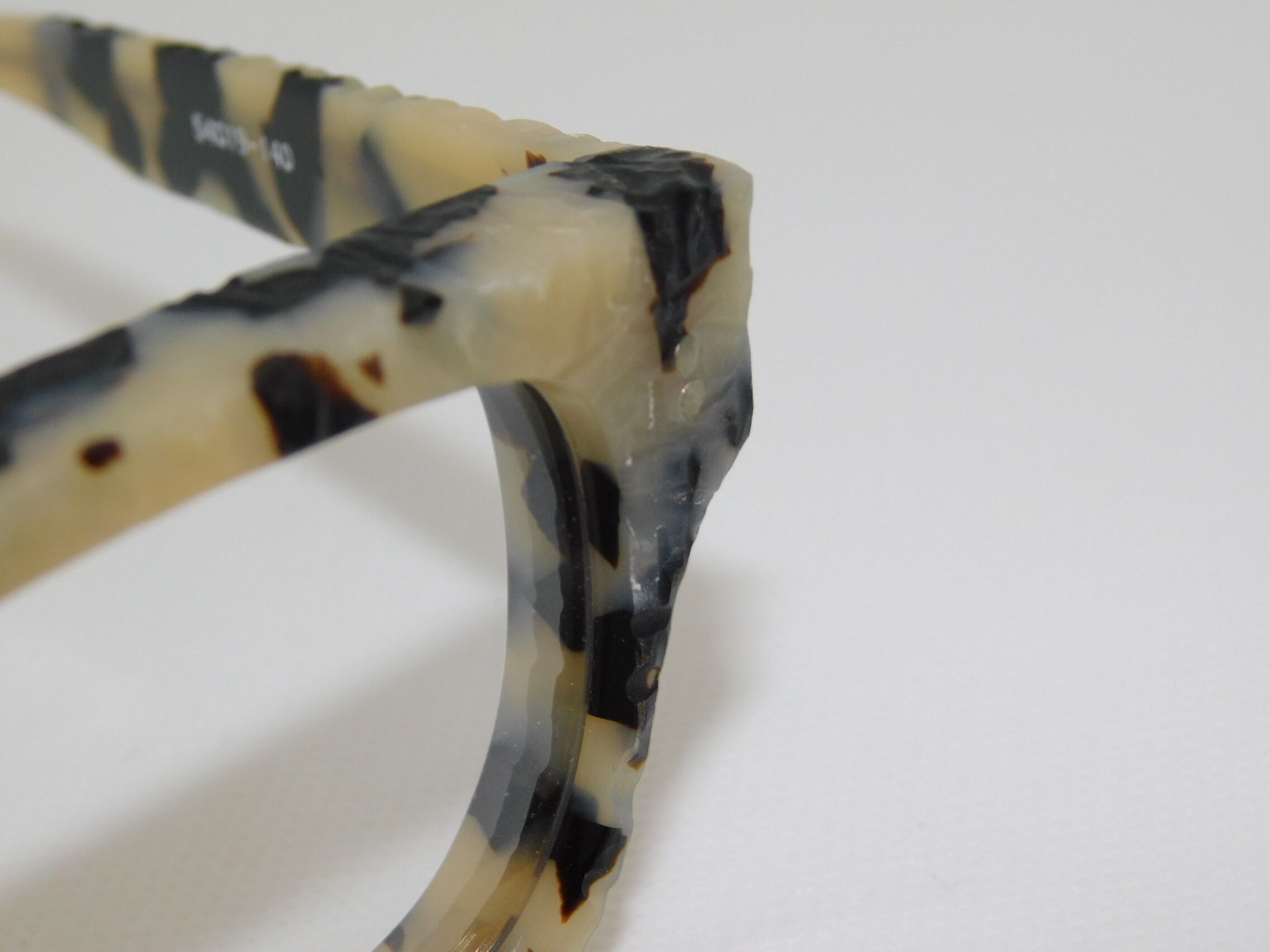 本商品は、アセテートのフレームに、ブランド独自の技法、「化石加工」が施されています。1枚1枚、職人が手作業で、この質感を出すように、削り出しています。そのため、1枚として同じ模様はありません。