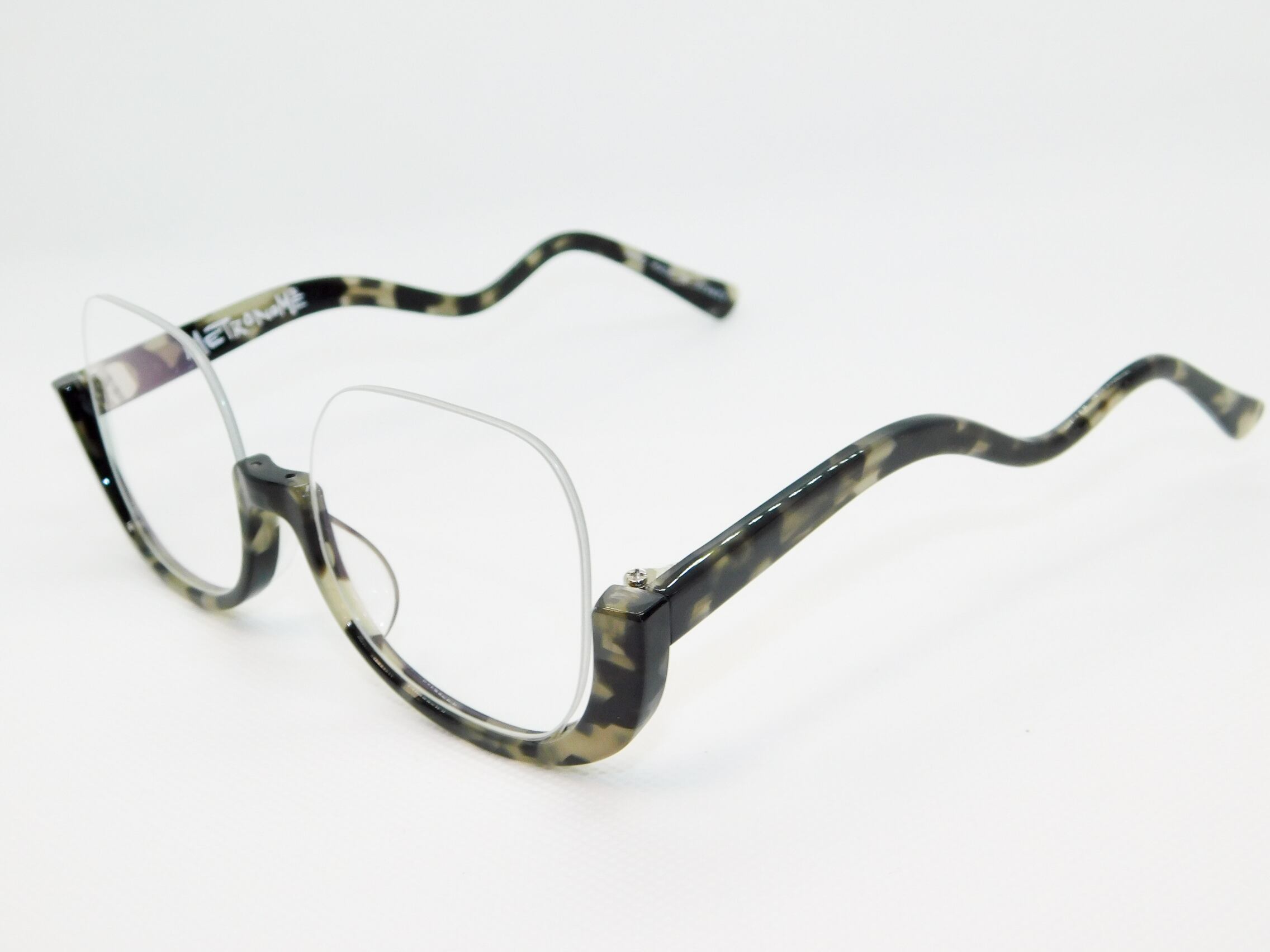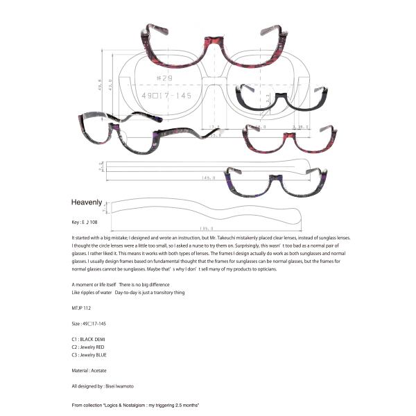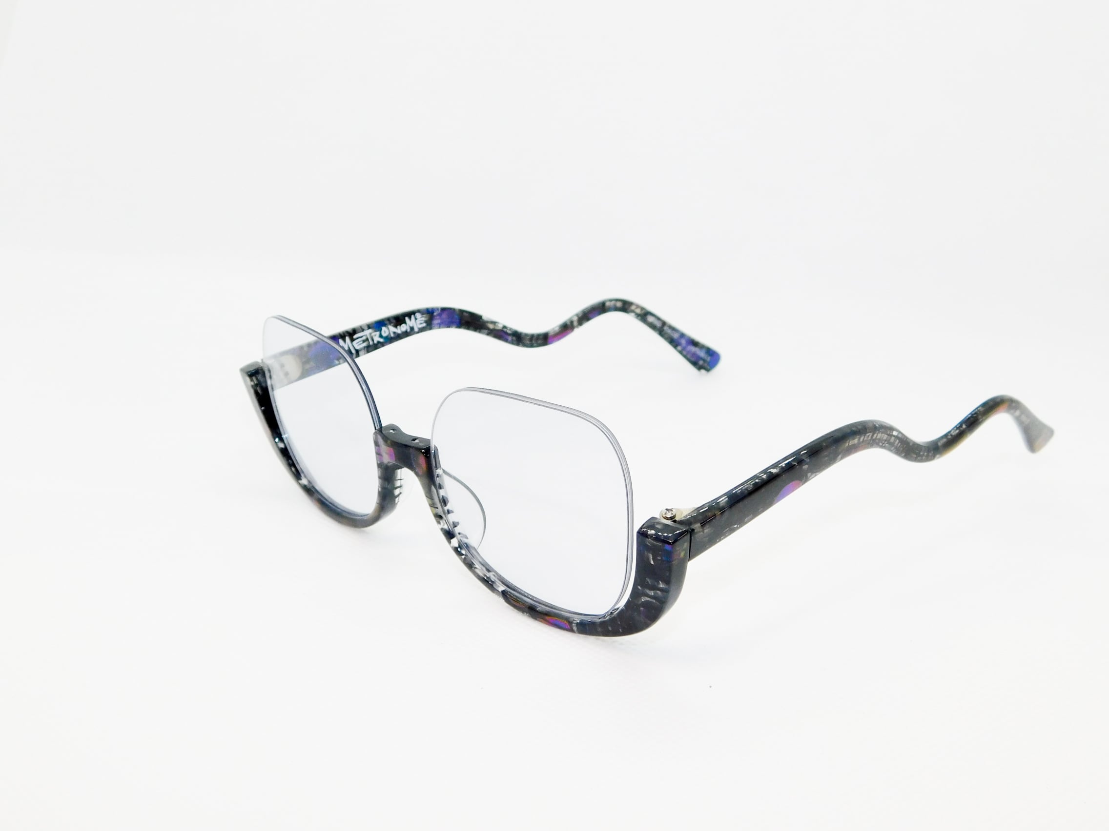 本商品は、アンダーリム構造でデザインされた、ユニセックス対応の眼鏡となります。リムとレンズが接する部分を少なくすることで、視界が広がりストレスを感じさせない構造になっています。 また、独特の形をしたテンプルは、シューティング加工後に、職人が1本ずつ、手作業で曲げていく、緻密な作業を経て完成されています。テグスは透明を採用しています。 本商品には、外箱、ハードケース、ソフトケース、クリーニングクロスが付属します。 サイズ : 49⬜︎17-145