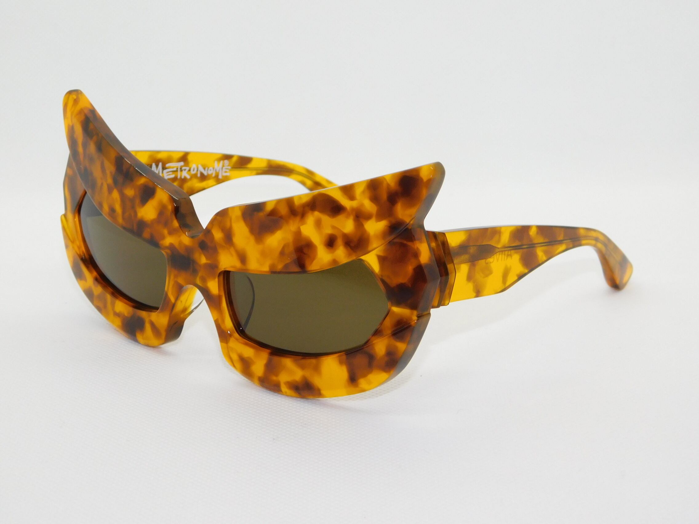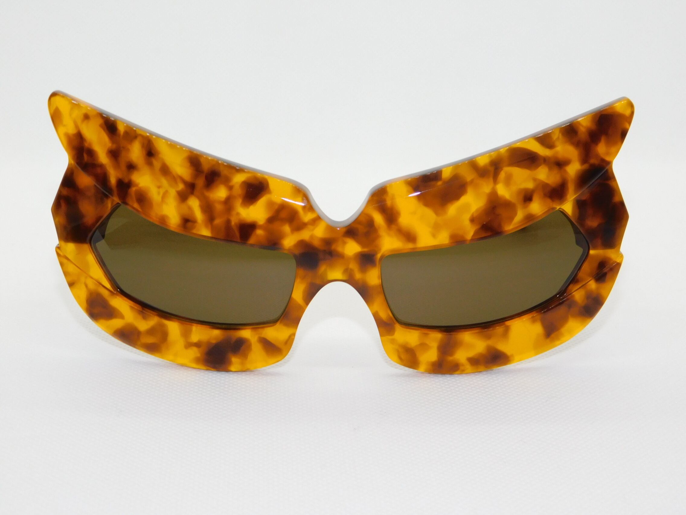 歌舞伎の隈取の様な「怒り」の感情を何処か匂わせる作品、フレーム形状も去ることながらレンズ形状も異質、サングラスというより感情を身にまとうようなどこか不思議でエキゾチックなアイウェア