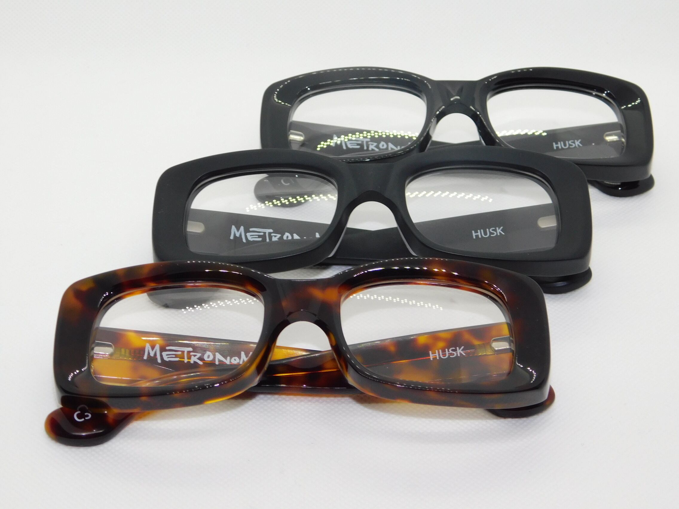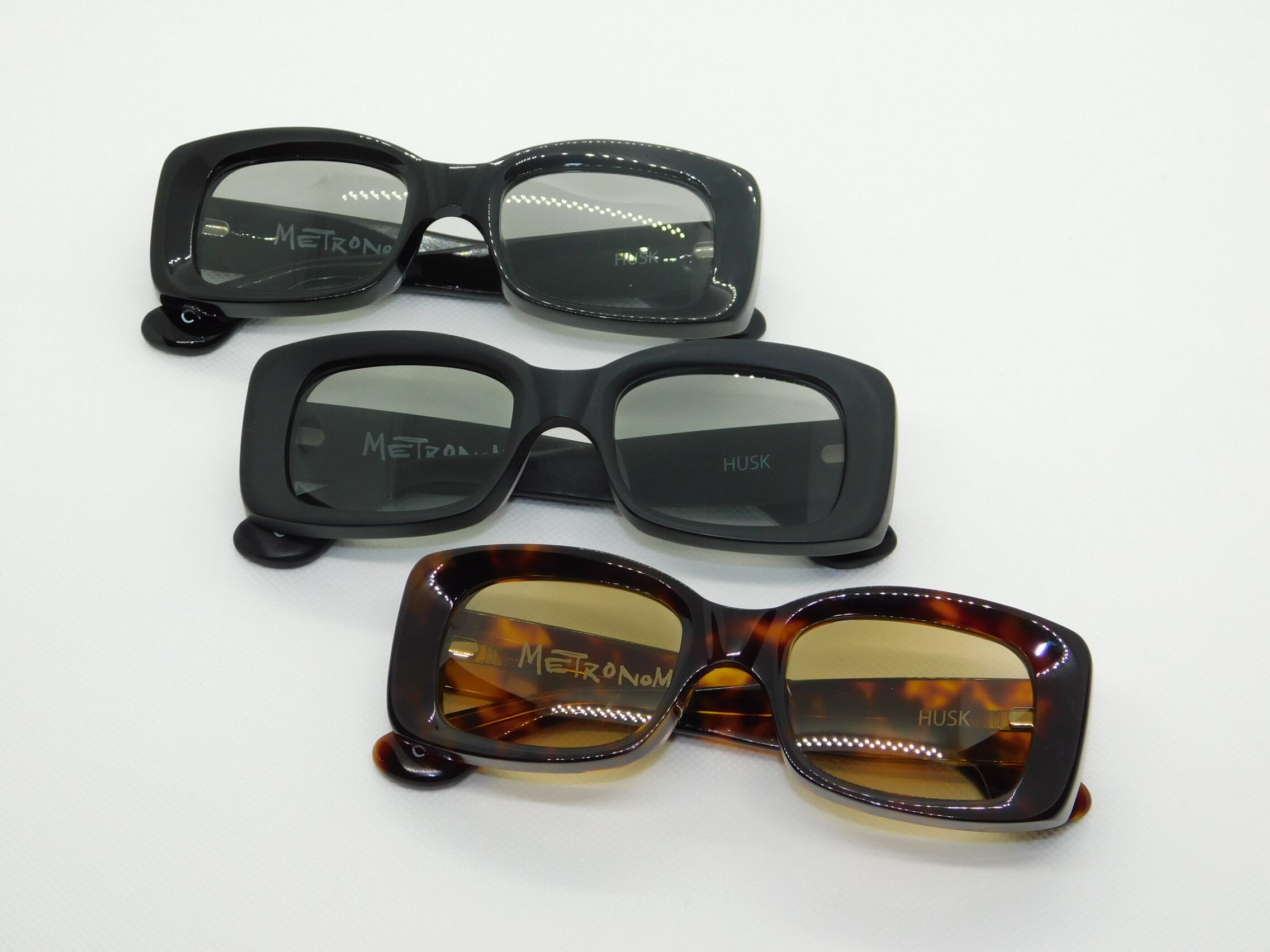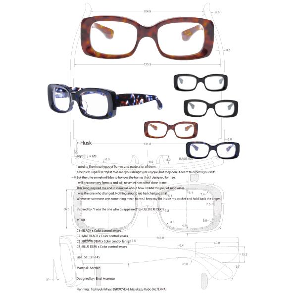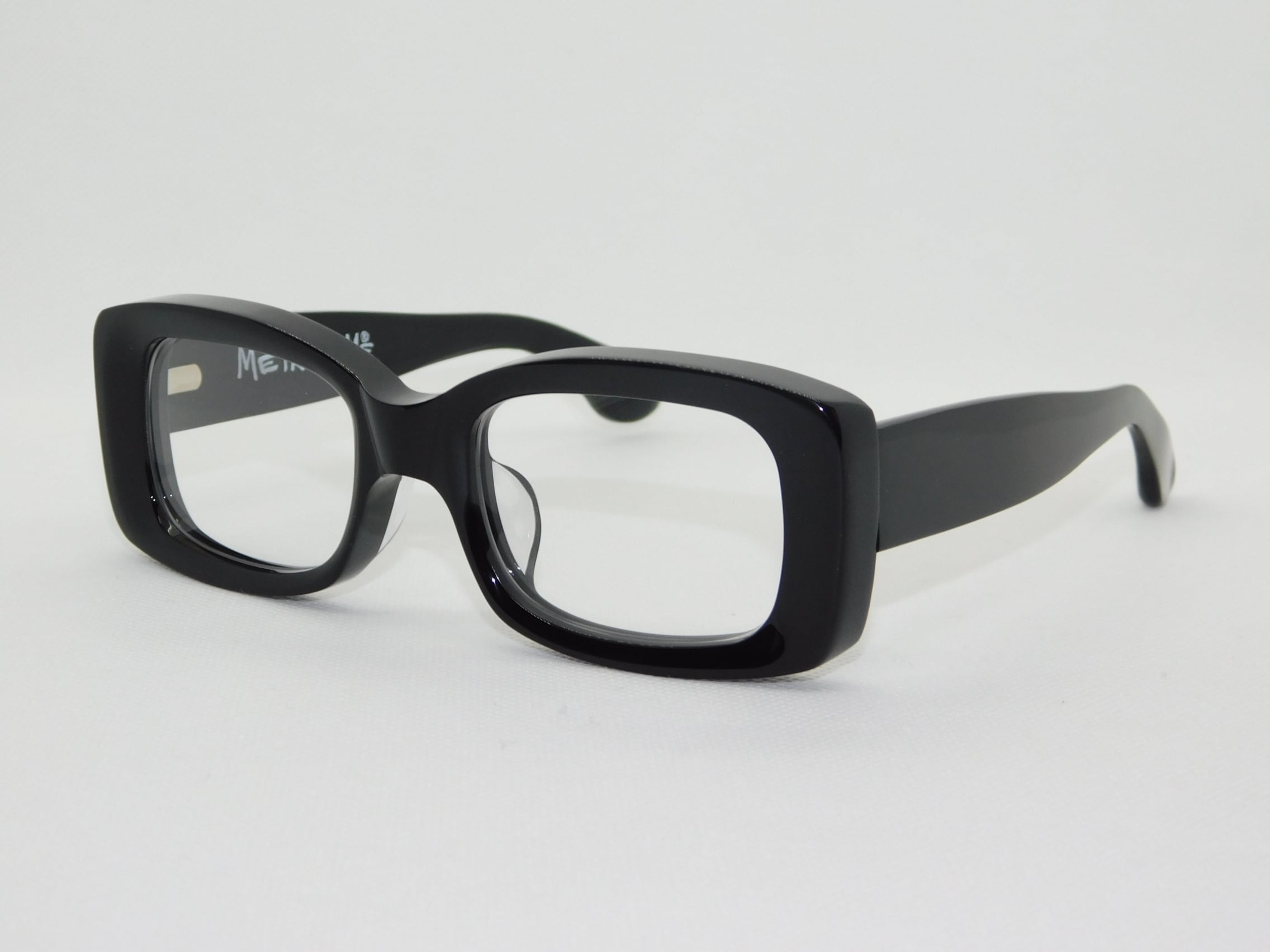 シンプルなスクエアにも見えるが厚みのある生地のフロントはレンズに向けてすり鉢状になっており、その立体感が顔の上で良いアクセントになっている。バネ丁番搭載なので掛かり心地も良好。紫外線で着色する調光レンズ搭載モデル